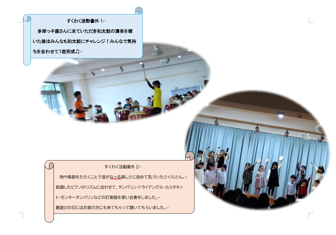 最後は劇遊びの中で、自分たちで選んだ打楽器を使い、ピアノの音色に合わせて合奏を披露しました!